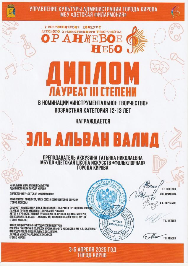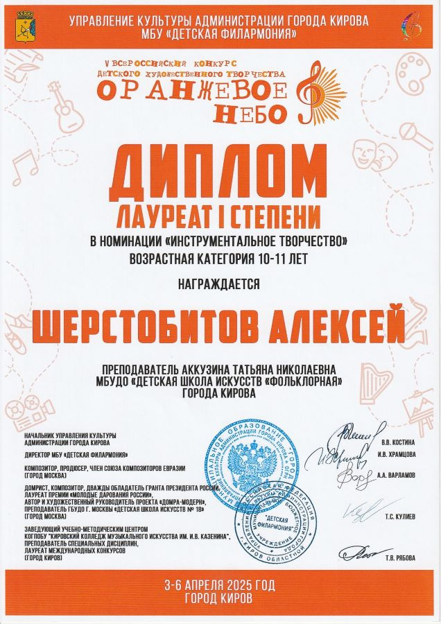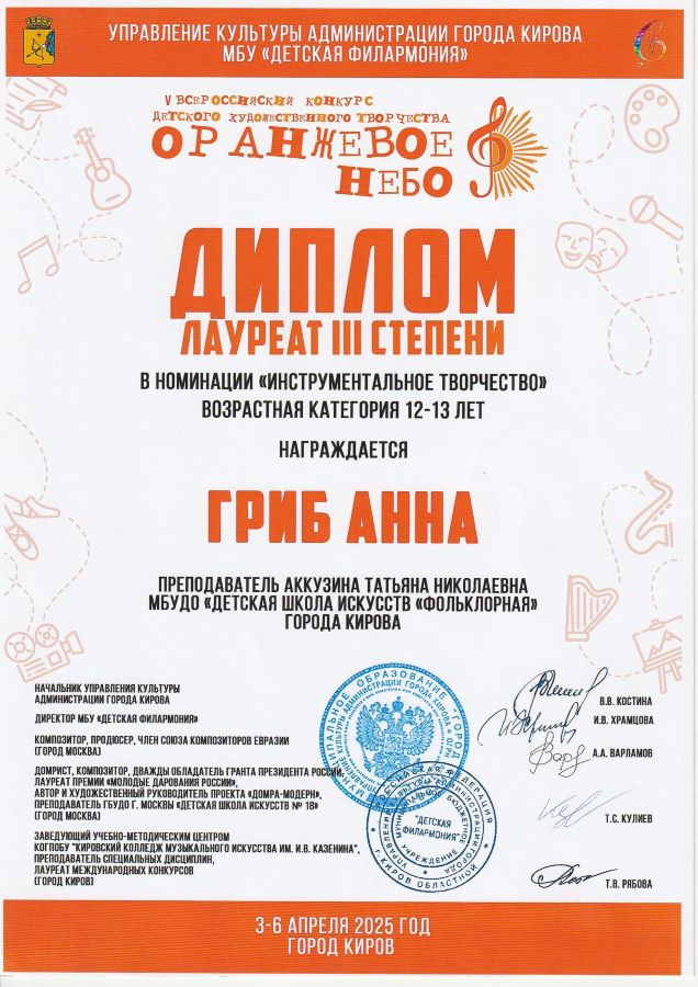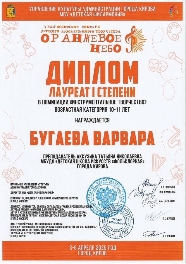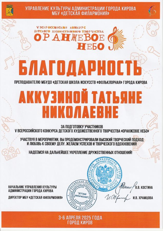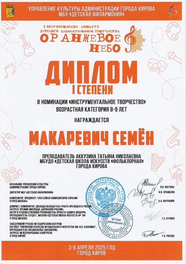 С 3 по 6 апреля, на базе «Детской филармонии» состоялся V Всероссийский конкурс детского творчества «Оранжевое небо»