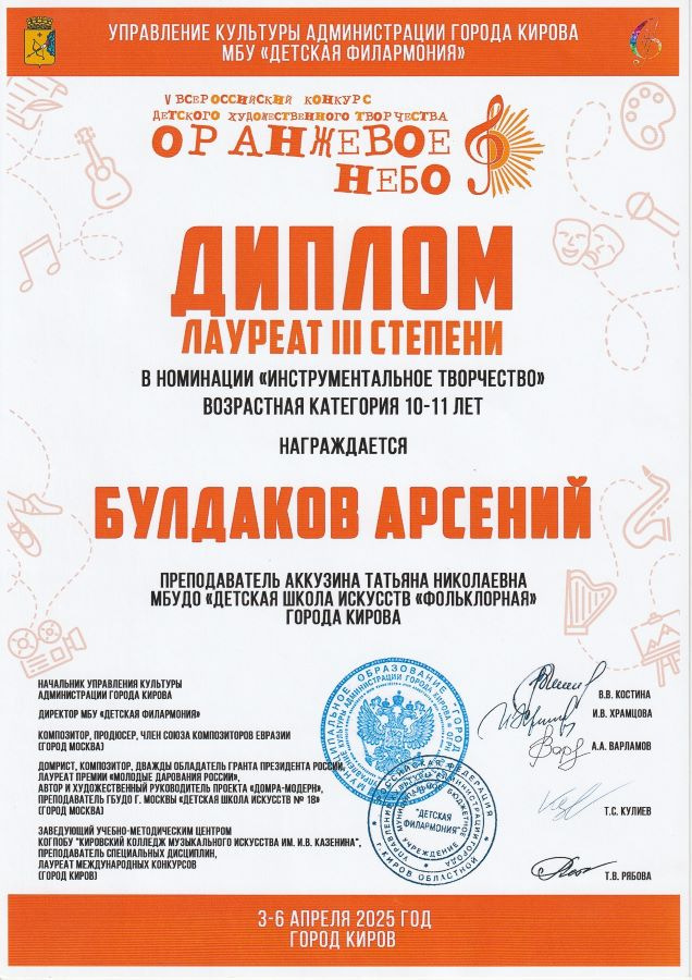 Лауреат III степени - Булдаков Арсений (преп. Аккузина Т.Н.)