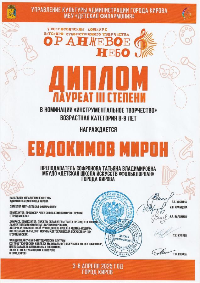 Лауреат III степени - Евдокимов Мирон (преп. Софронова Т.В.)