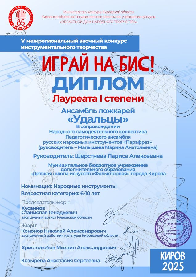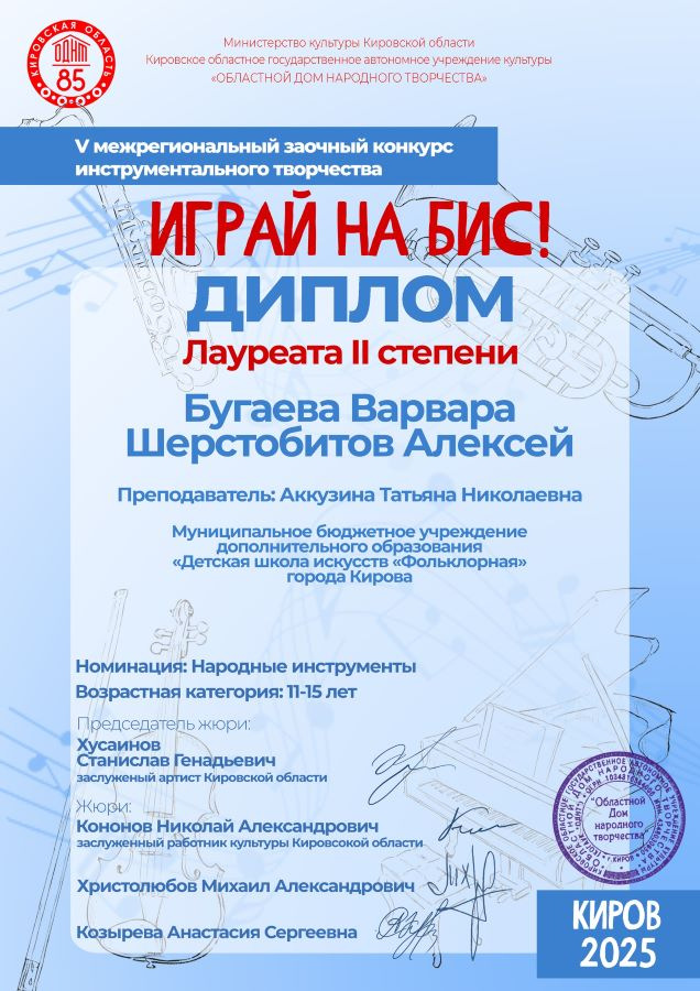 Итоги V межрегионального заочного конкурса инструментального творчества «Играй на бис!»: