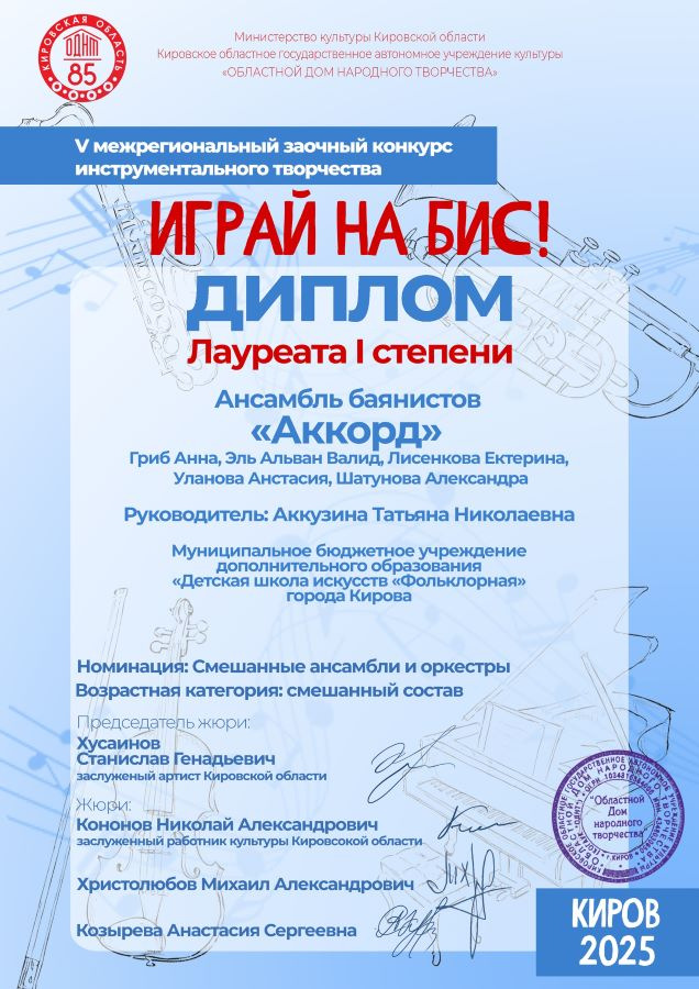 Лауреат I степени - ансамбль баянистов «Аккорд» (рук. Аккузина Т.Н.)