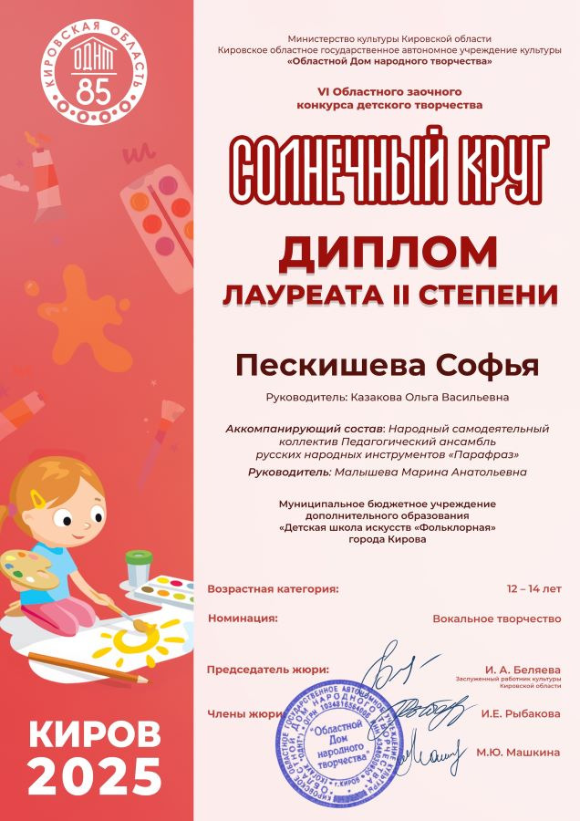 Диплом Лауреата II степени - Пескишева Софья (преп. Казакова О.В., аккомпанемент - педагогический ансамбль «Парафраз», рук. Малышева М.А.)