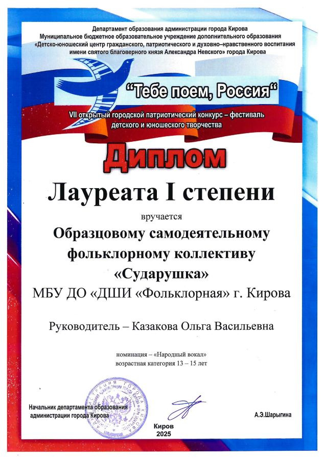 Лауреат I степени - Образцовый самодеятельный коллектив фольклорный ансамбль «Сударушка» (рук. Казакова О.В., конц. Пороль А.В.) Лауреат I степени - Кряжевских Софья (преп. Казакова О.В.)