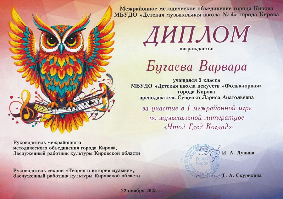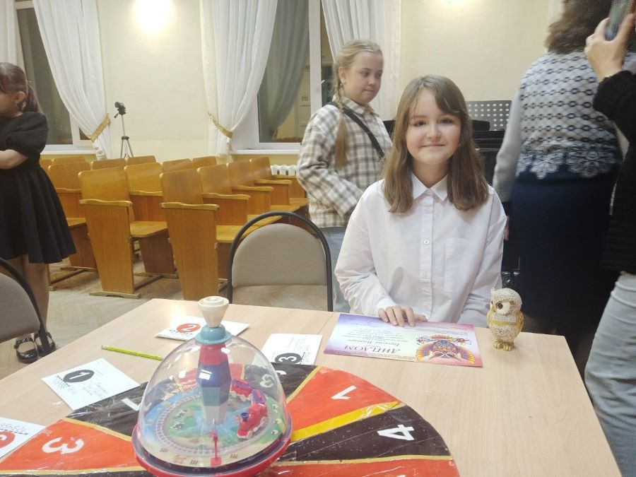 22 ноября в 16:00 в концертном зале Детской музыкальной школы № 4 состоялась первая межрайонная игра по музыкальной литературе среди учащихся 5 классов «Что? Где? Когда?». От каждой школы города в игре принимали участие по одному учащемуся. От нашей школы в командной игре приняла участие ученица 5 класса отделения Народные инструменты Варвара Бугаева (преподаватель Лариса Анатольевна Сущенко).