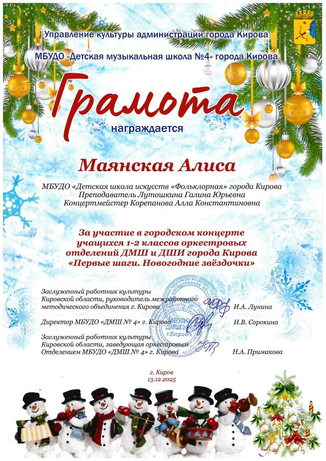 13 декабря в 16.00 в концертном зале Детской музыкальной школы № 4 состоялся городской концерт учащихся 1-2 классов оркестровых отделений «Первые шаги. Новогодние звездочки».