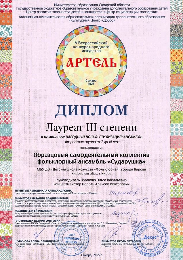 Лауреат III степени - образцовый самодеятельный коллектив фольклорный ансамбль «Сударушка» (рук. Казакова О.В., конц. Пороль А.В.)