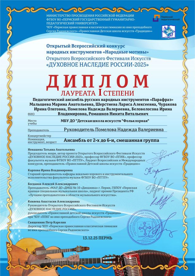 Итоги Открытого Всероссийского конкурса народных инструментов «Народные мотивы» в рамках Открытого Всероссийского фестиваля искусств «Духовное наследие России - 2025»: