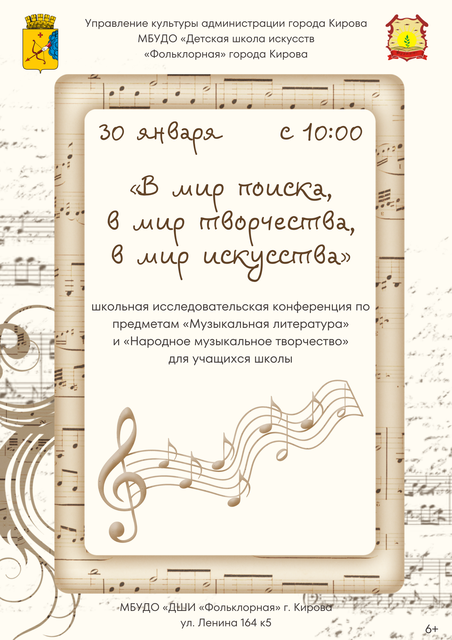30 января 2026 г. в 10.00 в МБУДО «ДШИ «Фольклорная» г. Кирова состоится III школьная исследовательская конференция «В мир поиска, в мир творчества, в мир искусства» по учебным предметам «Музыкальная литература» и «Народное музыкальное творчество».
