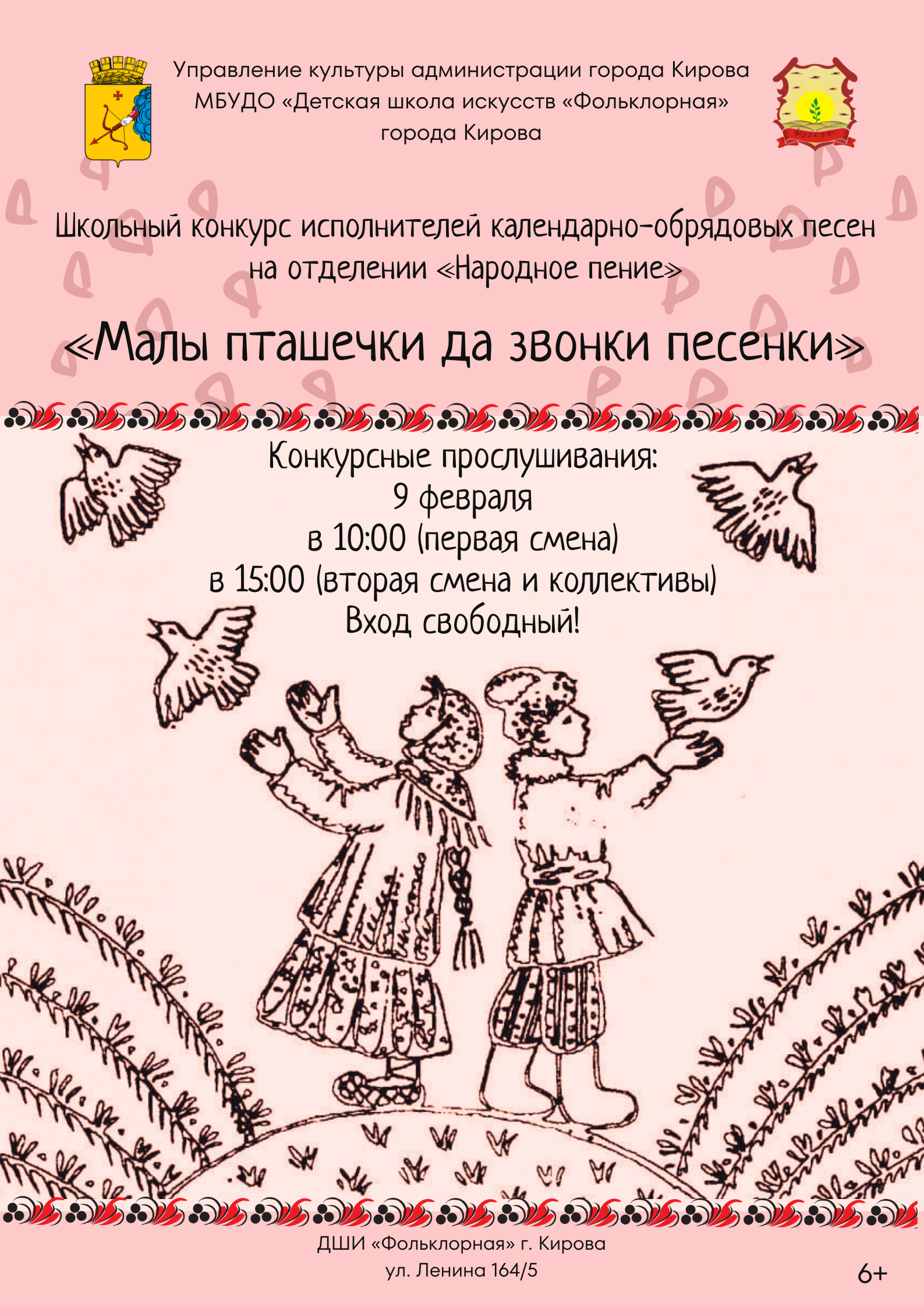 9 февраля 2025 г. в 10:00 и в15:00 в концертном зале МБУДО «ДШИ «Фольклорная» г. Кирова состоится школьный конкурс календарно-обрядовых песен «Малы пташечки да звонки песенки» среди обучающихся 3-8 классов отделения «Народное пение».