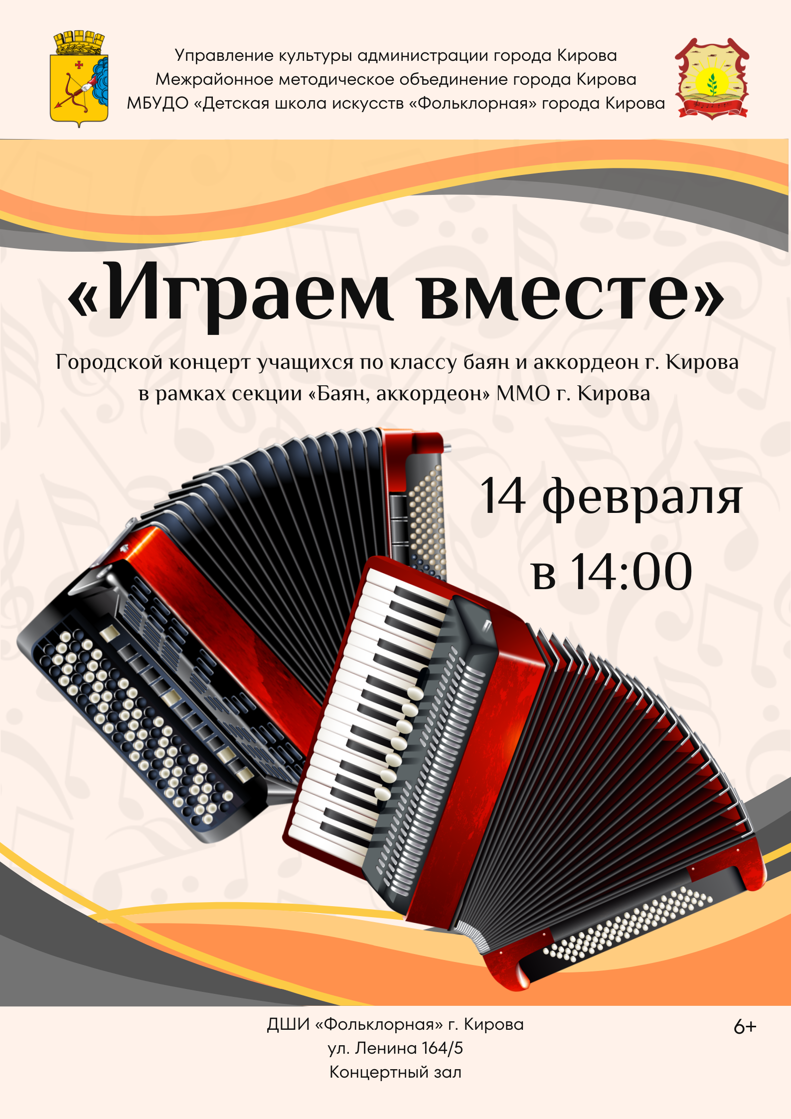 14 февраля 2026 г. в 14:00 в концертном зале МБУДО «ДШИ «Фольклорная» г. Кирова состоится городской концерт «Играем вместе» учащихся по классу баян и аккордеон г. Кирова в рамках секции «Баян, аккордеон» Межрайонного методического объединения г. Кирова.