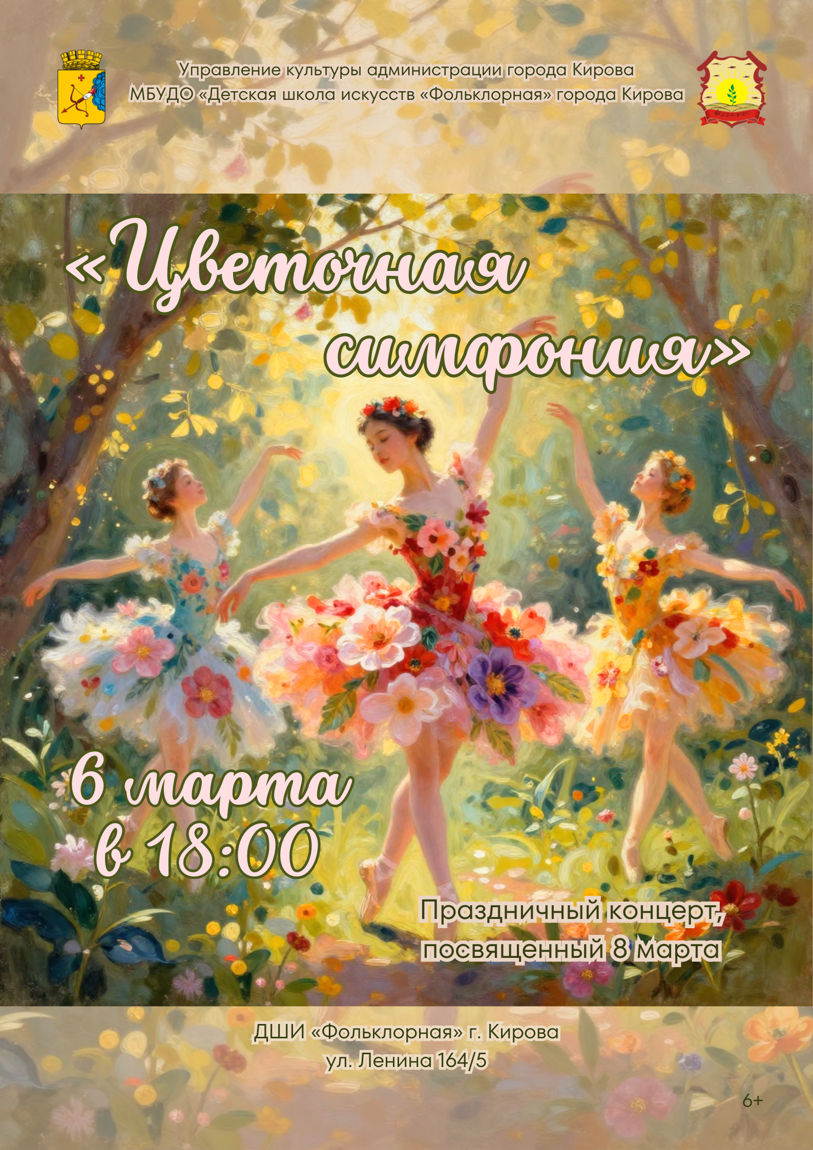 6 марта 2026 г. в 18:00 в концертном зале МБУДО «ДШИ «Фольклорная» г. Кирова состоится праздничный концерт, посвященный 8 марта – «Цветочная симфония».